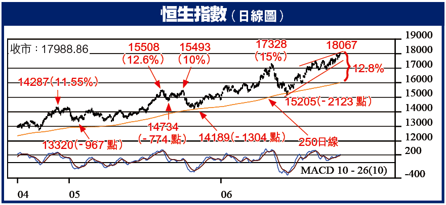 (4)今年5月8日,恒指最高17328,與當天250日線15054,距離15%,結果大跌至15205,共2123點。