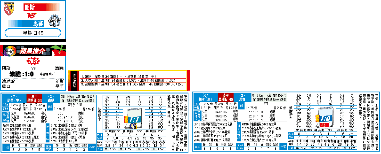 周日法甲聯進行前列大戰,暫列第2的馬賽作客挑戰第6的朗斯;以朗斯主場未嘗一敗,加上馬賽主力列貝利已露疲態,平手盤寧捧主隊。(球賽編號:星期日45;無綫收費26台及now826台明日3:00am直播)