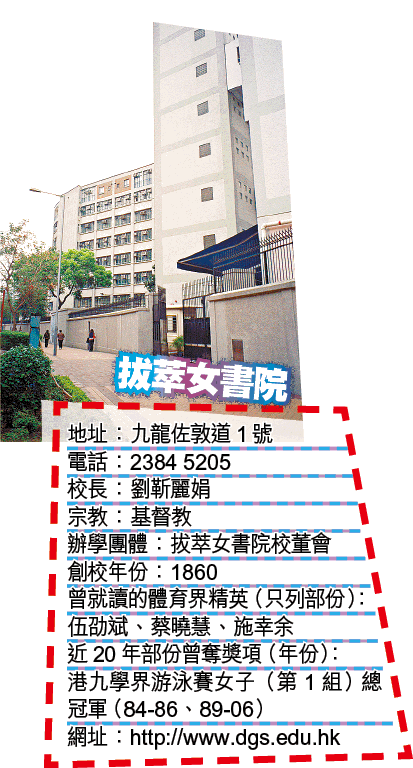 提起拔萃女書院,伍劭斌、蔡曉慧等游泳健將的名字即浮現眼前。該校多年來均為香港學界體壇的「龍頭」,不論熱門或冷門運動,「女拔」也是長久以來香港代表隊的「兵工廠」。