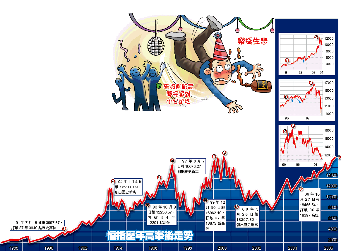市場擔心港股會否在派對的最高潮落幕,由牛市轉熊市,究竟後市是調整抑或轉勢呢?回顧過去20年,港股於1994、1997及2000年3次創出歷史新高後,恒指表現有兩大特色:一.首次打破歷史高位後,從未試過立即由牛轉熊,每次新高後必定再見數次新高,才會真正轉勢變為熊市;二.恒指新高與新高之間的調整中,必定有一次調整幅度甚深,多達2000點,其後短期內再創新高才轉勢(大圖)──由此推論,今次恒指創歷史高位後,將再有新高出現,但期間會有高達2000點的調整。