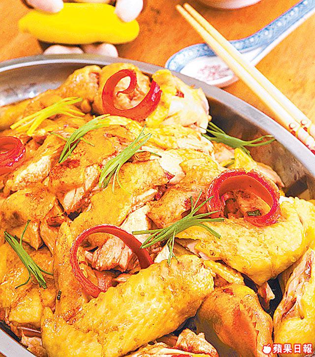 做法:雞洗淨以葱及鹽稍醃,之後以大火隔水蒸10分鐘至全熟,待涼後汁盛起,雞則斬件上碟,以先前盛起的雞汁加入調味煮至濃稠,淋上雞面即成。