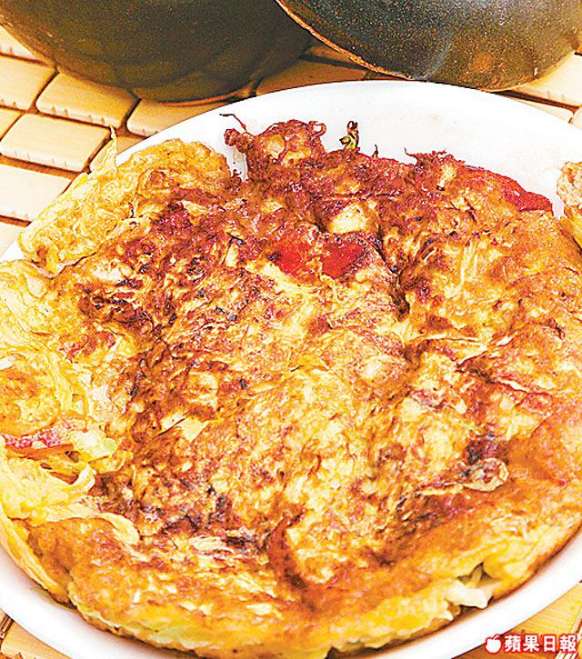 做法:椰菜及紅椒分別洗淨及切絲,打蛋加入所有材料及調味拌勻,燒熱鑊,下蛋汁煎成餅即成。