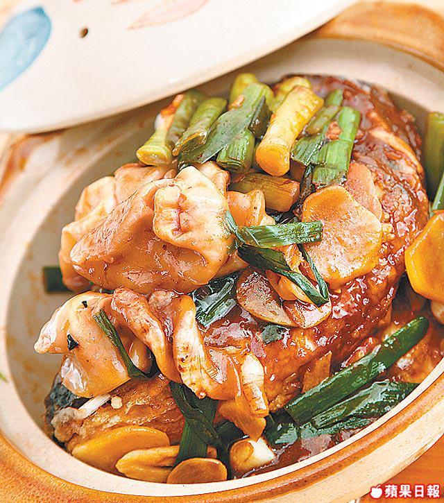 做法:魚頭洗淨切件,以醃料稍醃後沾生粉炸香待用。魚鰾刺穿洗淨,燒熱砂鍋,以蒜頭、薑、葱及冬菇起鑊,爆香後加入魚鰾爆香,之後加入魚頭合上蓋燜一會,汁收亁灒酒即成。