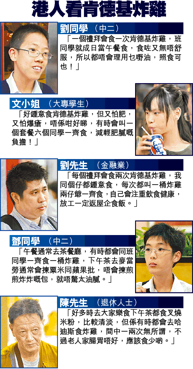肯德基和很多連鎖快餐店一樣,為慳錢和方便,使用氫化加工的植物油煮食,但這種油含大量反式脂肪,會增加血管閉塞和患心臟病機會。紐約市政府現計劃全面禁止餐廳食肆使用反式脂肪,紐約的龐大市場,令全美以至全球快餐業都受到更弦易轍的壓力。肯德基就在前日(周一)宣布,全美5,500間分店,明年4月起停用反式脂肪食油。