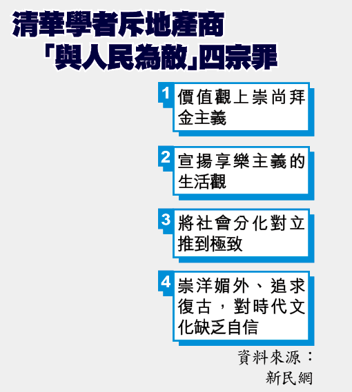 「我們(的城市)被一處一處小的租界(霸佔,)變成了租界城市。」清華大學建築學院院長助理、副教授周榕,炮轟內地地產商佔用城市資源、與人民為敵,他數出地產商宣揚享樂主義的生活觀等四大罪狀。地產商則高調反擊,強調對GDP(國內生產總值)稅收貢獻最大,由此引發網民論戰。