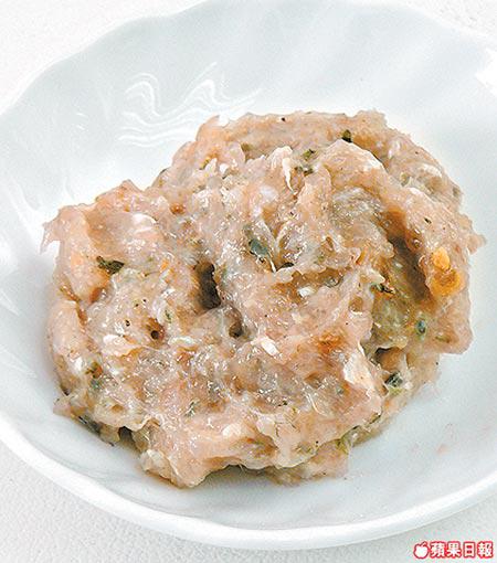 材料:鯪魚肉4両、葱1棵、白菜2両、火腿1片、豬肉碎2両