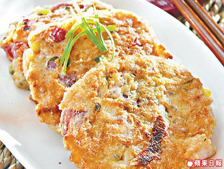 做法:芋頭隔水蒸10分鐘至軟身後壓爛待用,蛋打勻,臘腸、葱及芫荽切碎,連同魚肉一同加入芋泥中拌勻,下調味之後,燒熱鑊,以湯匙??適量芋泥於鑊中,再用鑊鏟將芋泥壓平成餅狀,煎至兩面金黃即成