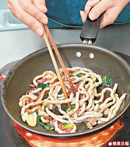 做法:豬肉醃10分鐘,白菜切碎、火腿切絲待用。葱切碎混合魚肉,再放入唧袋內,於袋尖剪小角,將魚肉唧落滾水中成魚麵,再次滾起即可撈起瀝亁。燒熱鑊爆香肉碎,加入菜炒至半熟,之後放入魚麵同炒,最後埋薄芡及放入火腿絲兜勻。