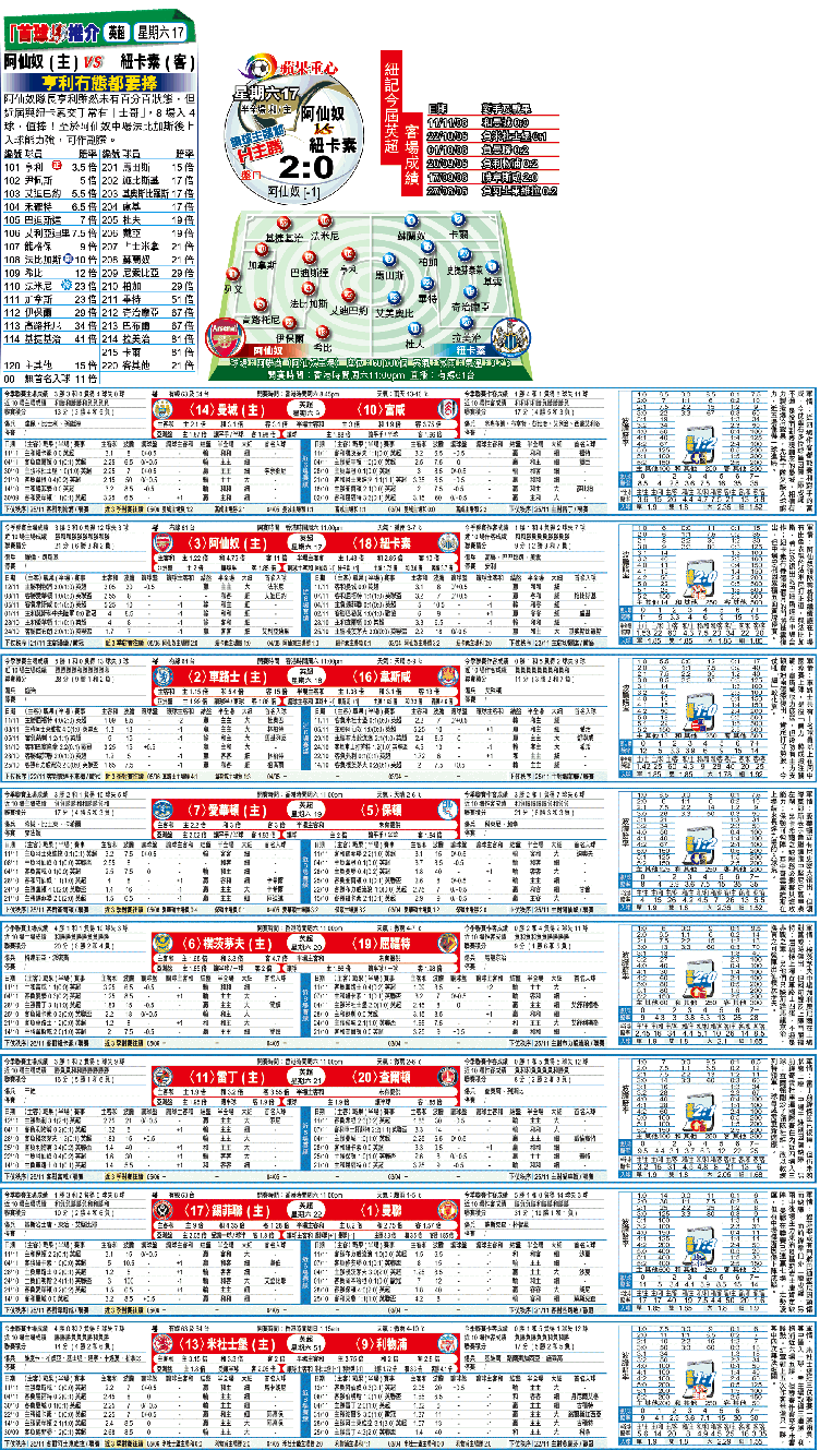 「兵工廠」阿仙奴周六在英超聯主場對攻不銳守不穩的紐卡素,穩執3分,一於捧「讓球主客和」的「主勝」,再補入球「細」。(球賽編號:星期六17;有線61台今日11:00pm直播)青蛙仔
