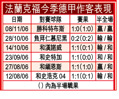 不過翻看法蘭克福今季的6場作客賽果顯示,原來只要球隊能夠在上半場取得領先或不敗,最終便可以順利勝出或賽和對手(見附表)。反觀今仗對手波琴,如果未能在上半場取得領先,球隊最終的失分率高達67%,而且一旦半場落後,球隊的落敗率更超越8成。