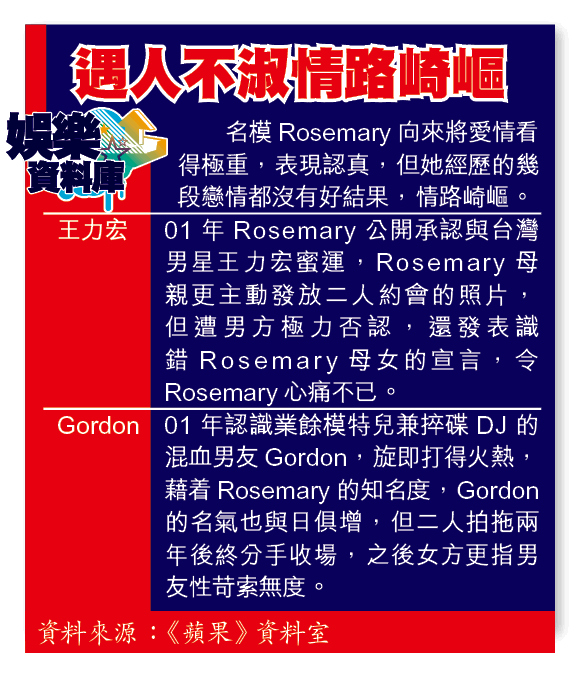 名模Rosemary日前被本報拍到與男友Christopher在地鐵開火嘈交,Christopher事後狂數Rosemary為人太高調、講大話兼愛面子,自爆已和她分手兼搬走。Rosemary昨日含淚力數男方另結新歡兼利用她,直斥對方是「戲子」,而一向反對愛女拍拖的星媽Julie更怒罵男方「財色兼收」。不過Rosemary其實早已暗渡陳倉,雖情傷未癒,昨日凌晨已火速夜蒲力𠝹中坑。