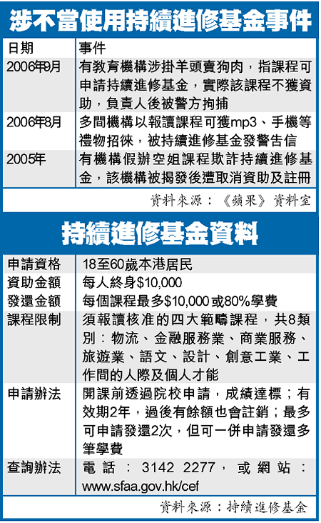 持續進修基金總行政主任歐陽畹華接受本報查詢時說,目前全港300多間課程提供者、共有5,000多個可申請發還學費的課程,多年來只有少於5宗因欺騙基金而遭警方檢控,欺詐情況不嚴重,警方今年九月亦成功拘捕一間機構負責人,他涉嫌欺騙持續進修基金。