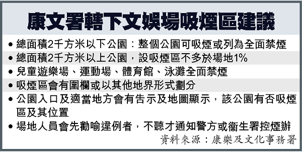 康文署過去兩天率先在沙田及東區區議會文康委員會講解公園設立吸煙區範圍的建議,康文署指出,轄下面積超過2千方米的公園,會闢不逾1%面積作吸煙區,但若屬兒童或體育設施,則不設吸煙區。面積少於2千方米一律全面禁煙或列可吸煙。泳灘、運動場及體育館一律禁煙。
