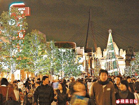 穿過「光之步道」,面前就是高36米的聖誕樹,這棵超巨型聖誕樹肯定是今年全日本的No.1。聖誕樹掛滿彩燈,晚上太陽一下山就亮燈,13萬顆燈泡將成個影城的天空照得亮亮的。而且每晚都會有「WhiteChristmasCarol」表演,由一班來自NewYorkOpera的樂手將耶穌生日的信息公告天下。聽着他們柔揚的小提琴演奏和嘹亮的歌聲,再看着天使的舞蹈,身邊的情侶情不自禁地擁吻起來,我知我知,氣氛是很浪漫,不過可否顧顧我的感受呢?