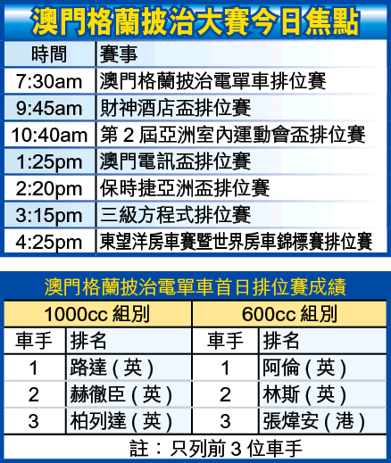 至於爭持最激的東望洋房車賽,由於目前9名前列車手的分差只是20分,故將在澳門決出今年的世界房車錦標賽總冠軍,當中領先為英國車手派奧,但巴西的法夫斯及德國的梅拿兄弟俱有機會在此站反先,而昨日眾車手進行首天試車,為今日的排位賽作準備。