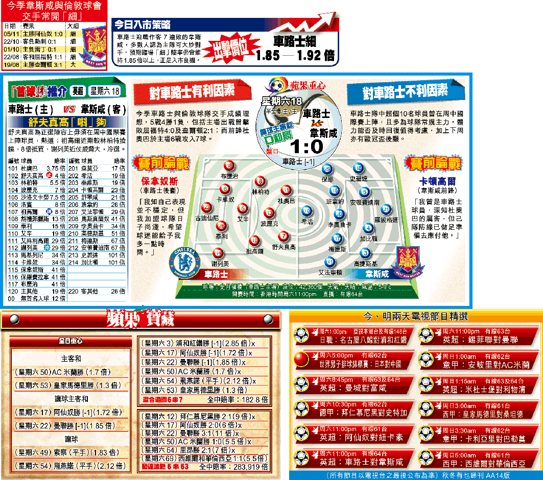 另一支持今仗開「細」的理由,為韋斯咸今季是一支唔識入波的球隊,近8場聯賽便佔6場交白卷;當中面對實力較強的對手,韋斯咸總會改打4-5-1偏向防守陣式。早前主場勝阿仙奴1:0便曾出現死守情況,今仗隨時又施展密集戰術。更何況,韋斯咸今季與倫敦球會交手,暫開出1「大」4「細」(見附表)。