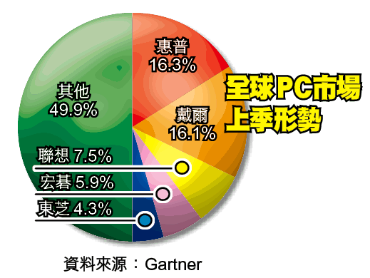 此外,惠普06年度的整體銷售額,將可望超越「藍色巨人」國際商業機器(IBM),成為資訊科技界領袖。據ThomsonFinancial預測,IBM截至今年底止06年度銷售額,預期達907億美元,較惠普的917億少10億美元。實際上,惠普上季已超越戴爾,重奪全球個人電腦市場一哥地位,反之,戴爾卻禍不單行,被搶去領導地位後,更因被美國證監會調查賬目,須延遲公布第3季業績。