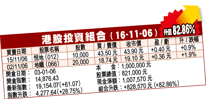 前日買入的恒地(012),早市曾高見44.40元,升逾2%,可惜跟隨大市回落後,未能重返高位,最後只升0.40元,收43.90元。聯交所資料顯示,ThirdAvenueManagement於周一增持恒地5001萬股,每股作價43.025元,最新持股量7.01%。四叔昨日異常風騷,話買股票好過做地產,仲話佢手上股票隻隻賺錢,閒閒哋升一個、半個開。趙飛雲則希望恒地短期股價升番一兩成,潤飾一下投資組合的成績。