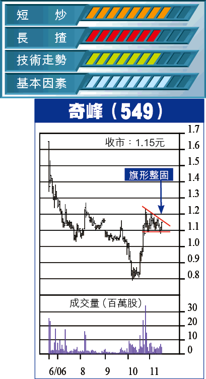 奇峰今年6月以1.69元招股上市,噚日收1.15元,仲係潛水,股價上返招股價,以07年預測PE計,只係6.7倍,仲係好吸引。奇峰上月中由0.80元回升,在1.10元至1.20元間橫行大半個月,噚日已轉強勢,一破阻力,最小量度升幅係1.60元。
