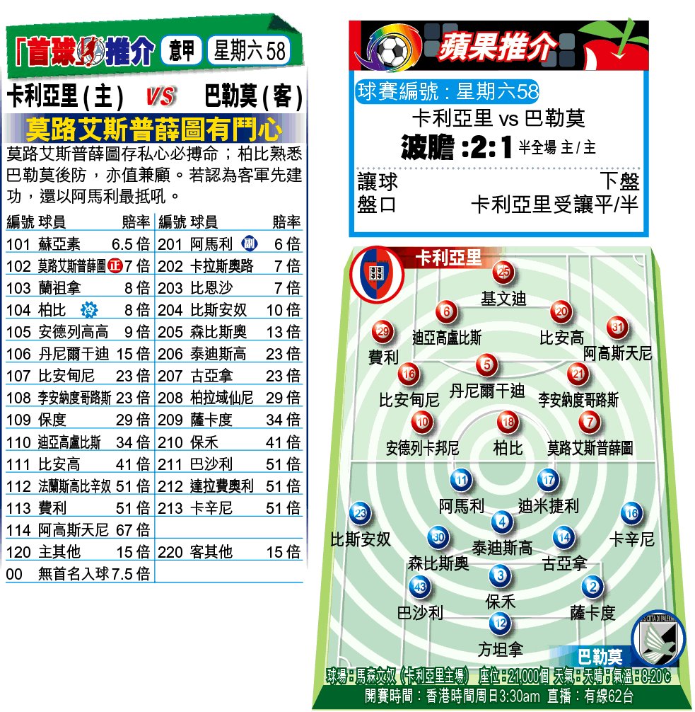 卡利亞里近年未嘗在主場不敵巴勒莫,雖然該隊今仗續有射手蘇亞素因傷避戰,只是仍有倒戈的柏比及前意大利國腳莫路艾斯普薛圖支撐,切忌過份忽視卡隊的攻力。莫路艾斯普薛圖有一定級數,近日盛傳他頻向首都球會羅馬送秋波,務必在比賽中施展渾身解數,以博取蟬過別枝的機會。