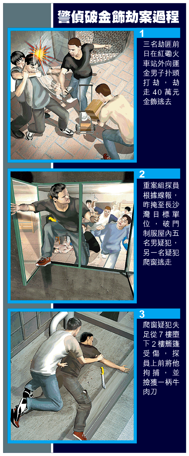 【本報訊】警方閃電偵破紅磡火車站「運金人」40萬金飾械劫案,昨午直搗長沙灣順寧道賊巢,擎槍拘捕六名「烏鼠」,其中一疑犯越窗逃走時跌下五層樓重傷送院。至於案中被扑頭重傷運金人,昨晚證實不治。警方相信該打劫集團由港人主腦操控,聘用非法入境者來港犯案,將20多年前省港旗兵的行劫模式重現。警方情報顯示,賊匪行劫時備有手槍,極度危險,估計與近期多宗運金劫案有關。 記者:麥超億 黃偉民 黃傑偉