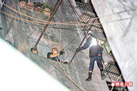 昨午5時,重案組探員空群出動,根據情報掩至順寧道473號七樓目標單位拘人,上址樓高九層,二樓為平台,有鋅鐵簷篷僭建物。探員擎槍戒備逐步上樓,爆門後發現屋內有六名男子,其中一人越窗爬渠逃走,經過一輪糾纏,探員制服屋中五名疑犯,並撿獲四把呎餘長的牛肉刀,至於爬窗逃走的姓劉疑犯不慎失足墮下鋅鐵簷篷,身上牛肉刀跌出,他因股骨爆裂,重傷待救,由救護員送院,目前情況危殆。