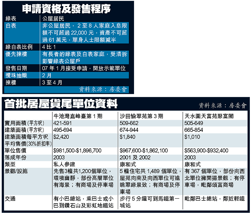 【本報訊】停售四年後,房屋委員會昨公布明年1月首批居屋貨尾單位售價,建成後荒置了三至四年的牛池灣嘉峰臺、沙田愉翠苑及天水圍天富苑共3,056個單位,全部以同區私樓市價約七折定價。有立法會議員和房委會委員批評定價太高,以往是市價五至六折,今次變相是托市以減少衝擊私樓價格。 記者:馮永堅 陸羽平 吳宛盈 蔡志郁
