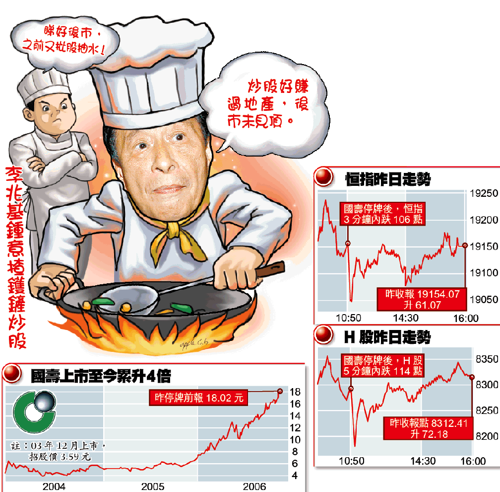 不過,國壽(2628)突然於10時50分停牌,市場恐懼國壽批股,投資者恐慌性沽售內地金融股以及中移動(941),恒指3分鐘急跌106點,H股指數5分鐘跌114點,冷靜後覺察國壽停牌與收購廣發行有關,兩指數隨即收復失地。