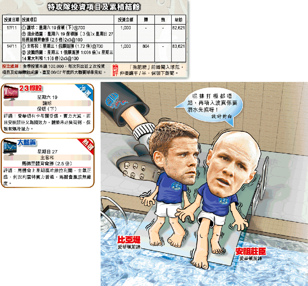 近期投資版嘅推介相當有水準,希望今次續令球迷獲利。言歸正傳,今期筆者揀嘅大藍籌屬於西甲聯賽事,捧馬德里體育會作客贏利雲特;而二、三線股係嚟自英超聯,冷門推介保頓作客愛華頓開下盤兼博冷W。文:賴恩