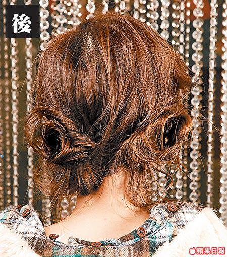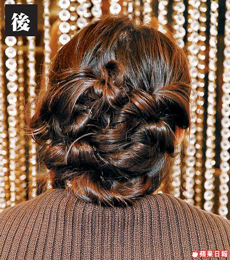 OL情迷長直秀髮,不過講到秋冬靚衫就會頭痛,衣服不是闊大樽領就是厚身毛毛領,長髮披散膊頭,容易產生頸短錯覺,因此不少人愛盤上一個大髮髻以避嫌,可惜卻過於工整,反而更顯老態。扭成多個小漩渦式髮髻,予人優雅高貴之感,面形顯得更修長。