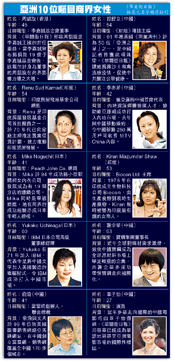 【本報訊】《華爾街日報》昨日公布2006年「亞洲矚目十位商界女性」,45歲的TOM集團大股東周凱旋(SolinaChau)獲選,成為有此項選舉以來首名上榜的香港人。《華爾街日報》稱,身為李嘉誠基金會董事的周凱旋,其影響力與日俱增,是她當選十大的主要原因。