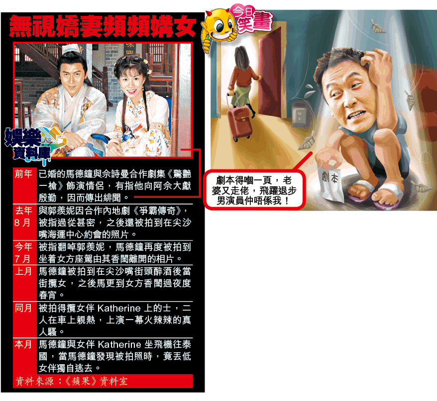 緋聞成籮的馬德鐘近日與圈外女友Katherine打得火熱,縱然他屢以家有妻兒作擋箭牌保形象,但昨日有周刊踢爆他與Katherine秘遊泰國,偷食斷正。據知忍到爆煲的馬太將從法國返港與丈夫攤牌,同時無綫也嫌馬德鐘形象負面,即時刪減他在60集重頭劇《歲月風雲》的戲份。看來今次馬德鐘的風流旅程,代價是賠了婚姻,也賠上事業。