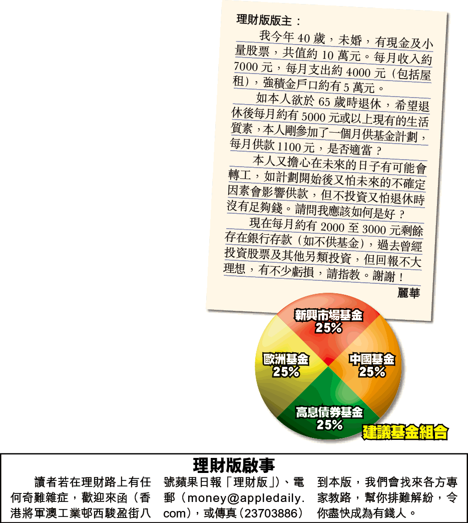 不過,你要留意,5000元生活費是否足夠退休生活,因為老年時有部份費用如醫療費等亦是值得注意的一環。幸而,你每月仍有2000至3000元可作投資,所以我建議你將此筆款項投資在沒有特定年期的基金,即使轉工亦不用擔心無法供款影響投資回報。