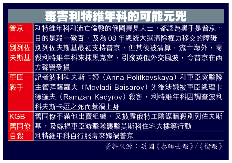 普京前天矢口否認與利特維年科之死有關,但究竟是誰下毒?人權組織深信是俄特工所為,目的是殺一儆百,要那些批評克宮的人收聲;但親克宮議員和官方傳媒將矛頭直指流亡倫敦的富豪別列佐夫斯基(BorisBerezovsky),認為別氏故意毒殺相識多年的利特維年科,嫁禍和抹黑普京。