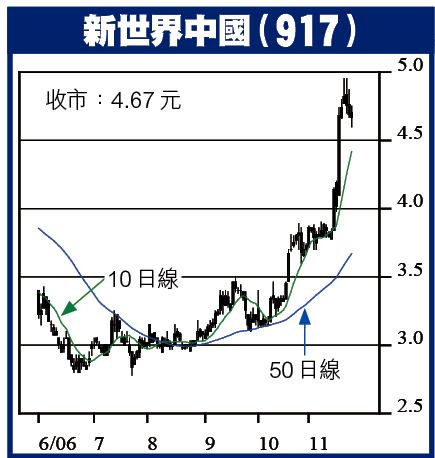 新世界中國(917)旗下物業組合遍布中國多個城巿,包括廣州、北京、武漢及瀋陽,總樓面面積約1700萬平方米。截至2006年6月底止年度,業績已得到顯著改善,股東應佔溢利為7.41億元,較上一年度同期增加3.5倍。