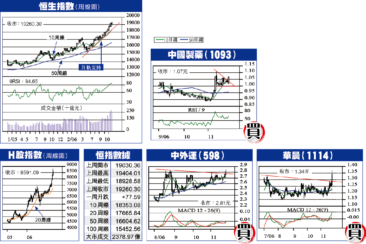 港股上周再創高位,主要由落後股長和系帶動,加上滙控(005)、中移動(941)等表現平穩,恒指創下歷史高位19404,收報19260,全周升77點,平均成交達475億元,雖較前周減14%,交投仍非常活躍。