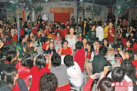 Twins成員蔡卓妍(阿Sa)於今個月22日24歲生日,不過正日嗰日佢同媽咪及朋友去咗日本旅行,所以前晚佢至同歌迷於元朗八鄉舉行盆菜宴慶祝,fans為佢筵開20圍,題為「蔡府壽宴」,所以當阿Sa去到盆菜宴現場時都不禁笑話:「嘩,好似擺酒咁。」而前晚嘅dresscode係紅色,所以佢嘅fans都紛紛穿上紅衫,恍如一片紅海。