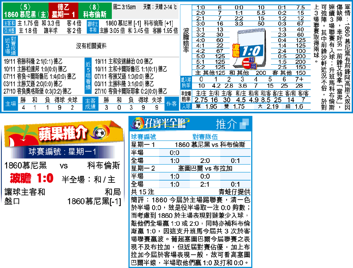 1860慕尼黑今屆於主場表現對辦,故周一在德乙聯獨腳戲迎戰升班馬科布倫斯,料可贏波。熱捧1.75倍的1860主W之餘,再博他們小勝1:0開「讓球主客和」「和局」及入球「細」。(球賽編號:星期一1;香港時間明日3:15am開賽)青蛙仔