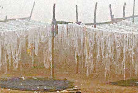 記者在區內採訪時,見到幾十輛三輪車正從兩個集裝箱車上卸載碎布條等垃圾,在路的兩旁到處可以看到有工人在木架上或田裏晾曬白色的布條。