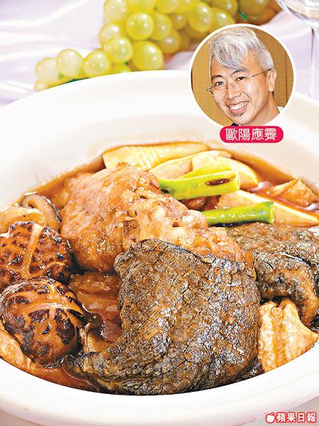 呢道係歐陽應霽創作的鱷魚菜式,用鮑汁燜,保留鱷魚的鮮味,鱷魚掌質地特別,既有膠質,又有肉食,阿霽話:「我最鍾意鱷魚掌,因為一碟菜式食到兩種唔同口感。」