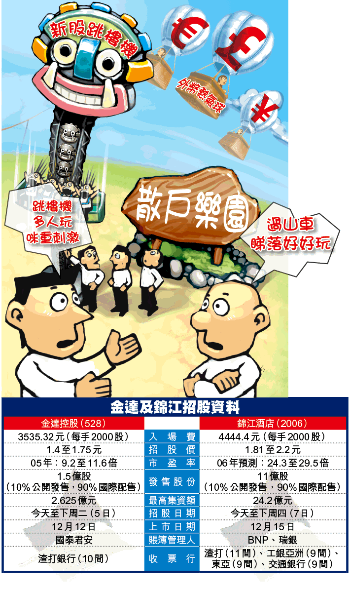 雖然中通信(552)及奧普(477)今日截飛,惟今明兩天共有三隻新股登場,為新股掀起新一波熱浪。今日公開招股,以純中國酒店股及經濟型酒店作招徠的上海錦江酒店(2006),被散戶認為「必抽」新股之一,入場費4444.4元,亞麻紗出口商金達(528)同日亦招股,每手3535.32元。雖然大部份證券行的孖展已被先前幾隻新股「借爆」,但估計有部份證券行仍能提供有限度的孖展服務。