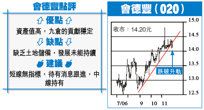 會德豐每股賬面資產22.09元,經九倉調整後應為27.85元,而股價14.20元,折讓49%,估計PE約10倍,但息率低於1厘,期望資產值可以反映,仍待多方面配合。