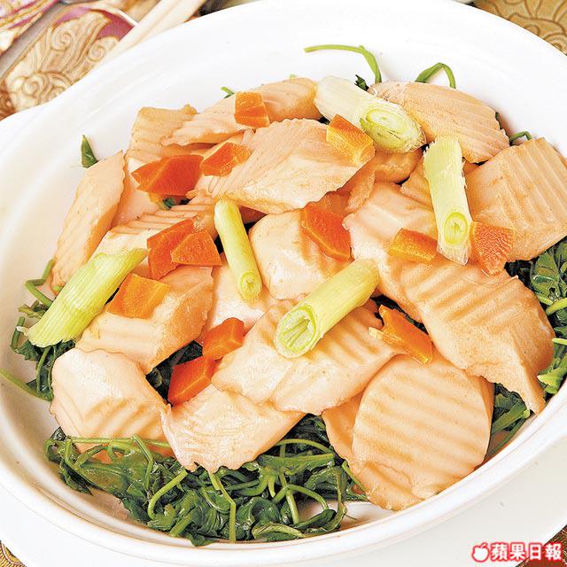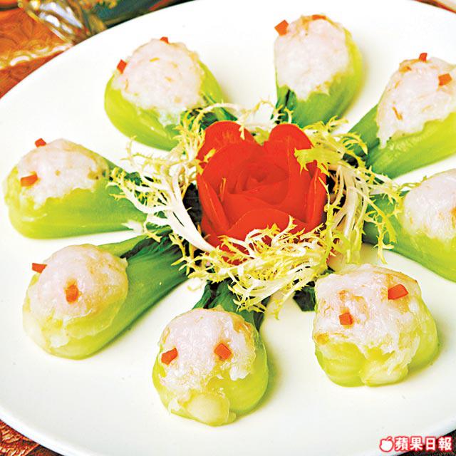 做法:中蝦去殼去腸後洗淨,以刀背壓爛後,加入糖和鹽再撻成蝦膠。小棠菜洗淨,菜莖處剪出少許位釀入蝦膠,甘笋切粗絲,插在蝦膠上作魚眼,隔水蒸約6分鐘,再煮滾芡汁淋面即可。
