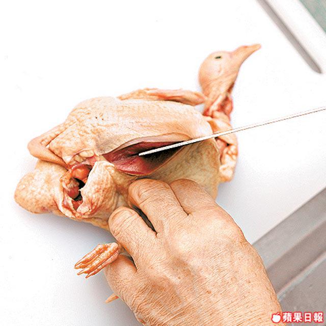 先在鴿背及鴿肚的位置開一刀。再在翼的骨位斬開,取去其筋骨後斬件即可。