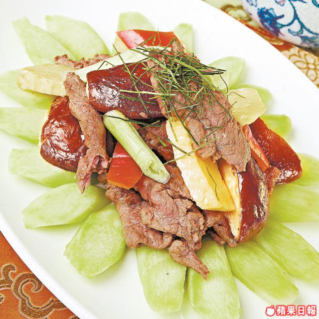 材料:鴕鳥肉5両、芥蘭1/2斤、冬菇6隻、冬笋4両、葱度/蒜片/檸檬葉/生粉/生抽各少許、油/上湯各適量