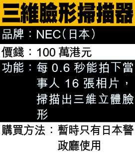 在美國電影中常見的三維臉形掃描器,原來日本的警政廳已普及使用。該套由NEC研發的掃描器(圖),能在0.6秒內拍下16張臉形照片,將拍攝對象的臉形以三維效果掃描出來。 該公司海外營業部發言人杉本朋子表示,只要將該系統的數據連接到該公司仍在研發階段的臉形識別器,日後只需將一些臉部影像不全的照片放進臉形識別器,就能分辨出對方是否相中人。 資料來源:世界電信展參展商