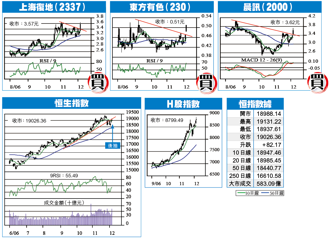 支持方面,仍看50日線18440點,由於逐步上移,已略高於前歷史高位18398點,預期短期內可守穩,暫時不會有較深的調整。反彈阻力方面,收市略高於10日線與20日線交滙處,並全數回補裂口區,即市阻力在前升軌19150點,再往上看,則有19404點歷史高位了。
