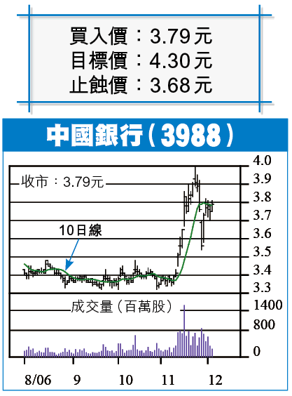 中國銀行(3988)昨收3.79元,升1.06%,股價連續第4天在10日線水平現「陀螺」,昨天之走勢有「破旗」形態,9RSI及MACD轉好,國內銀行股之大型升浪尚未完結,中行隨時炒上,上叩4元關,破位推向4.30元,成交連續縮減兩天,股價炒上,料有大成交配合,20日線上移至3.70元,為股價提供近距離的技術支持,現價買入,可以3.68元作止蝕位,上破3.83元,可加1注,上試4元若現太大沽壓,可先行沽出獲利,候低補回。