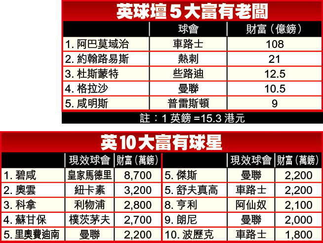 此外,《442》亦公布了英球壇最富有老闆的排行榜,車路士班主阿巴莫治域毫無爭議地位列榜首,較死敵曼聯的班主格拉沙多逾10倍。