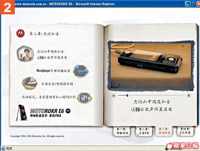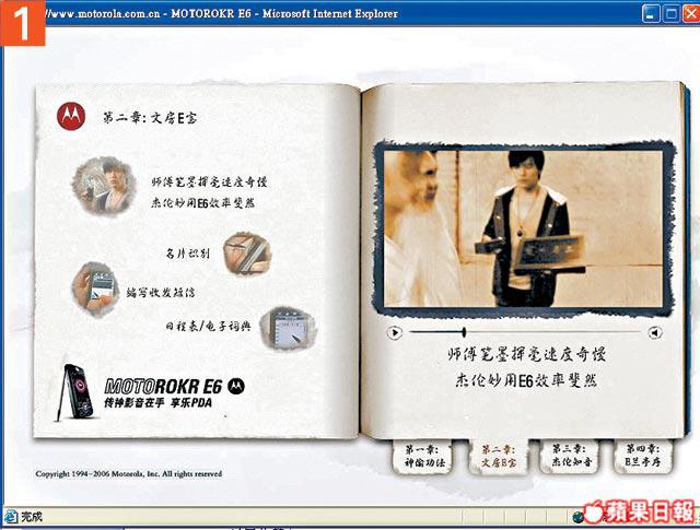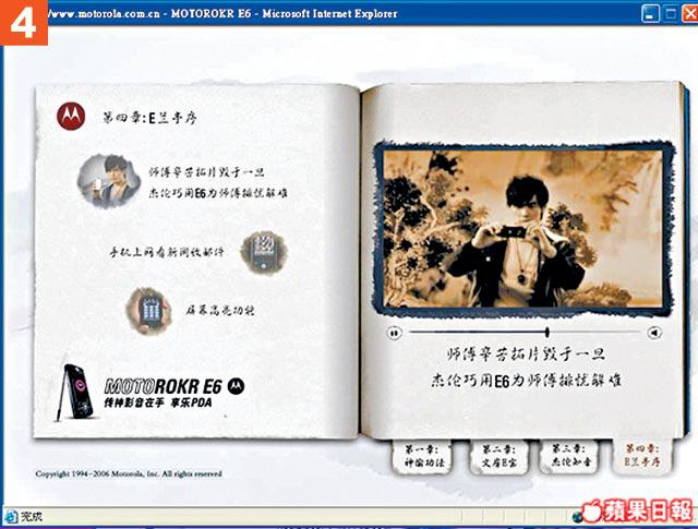 用得周董做代言人的E6,當然內內外外都找到他的影子,拉開包裝盒,就有Jay出現,Fans見到即叫!最重要是跟機送的1GB記憶卡,內容是阿Jay的《本草綱目》的MV和《我的地盤》鈴聲,仲有11款周董的Wallpaper。不過,最過癮還是阿Jay扮演武林高手,教你神功秘笈,仲分四個章節。背景是黑白的國語長片feel,講他爬上簷篷,用手機偷拍高手練武,身手敏捷,又用手機鏡頭支援電腦玩視像,仲教埋師傅拍片,其實都係想教大家手機各種功能。阿Jay自己都說:「宣傳應該幽默一點,現有很多小朋友都用手機,這個神功秘笈應該可以吸引他們。」雖然秘笈內功夫是有專人設計,但加埋Jay好似好認真,又好似好型的表情,幽默兼到point,好過睇說明書好多!最重要有阿Jay睇嘛!